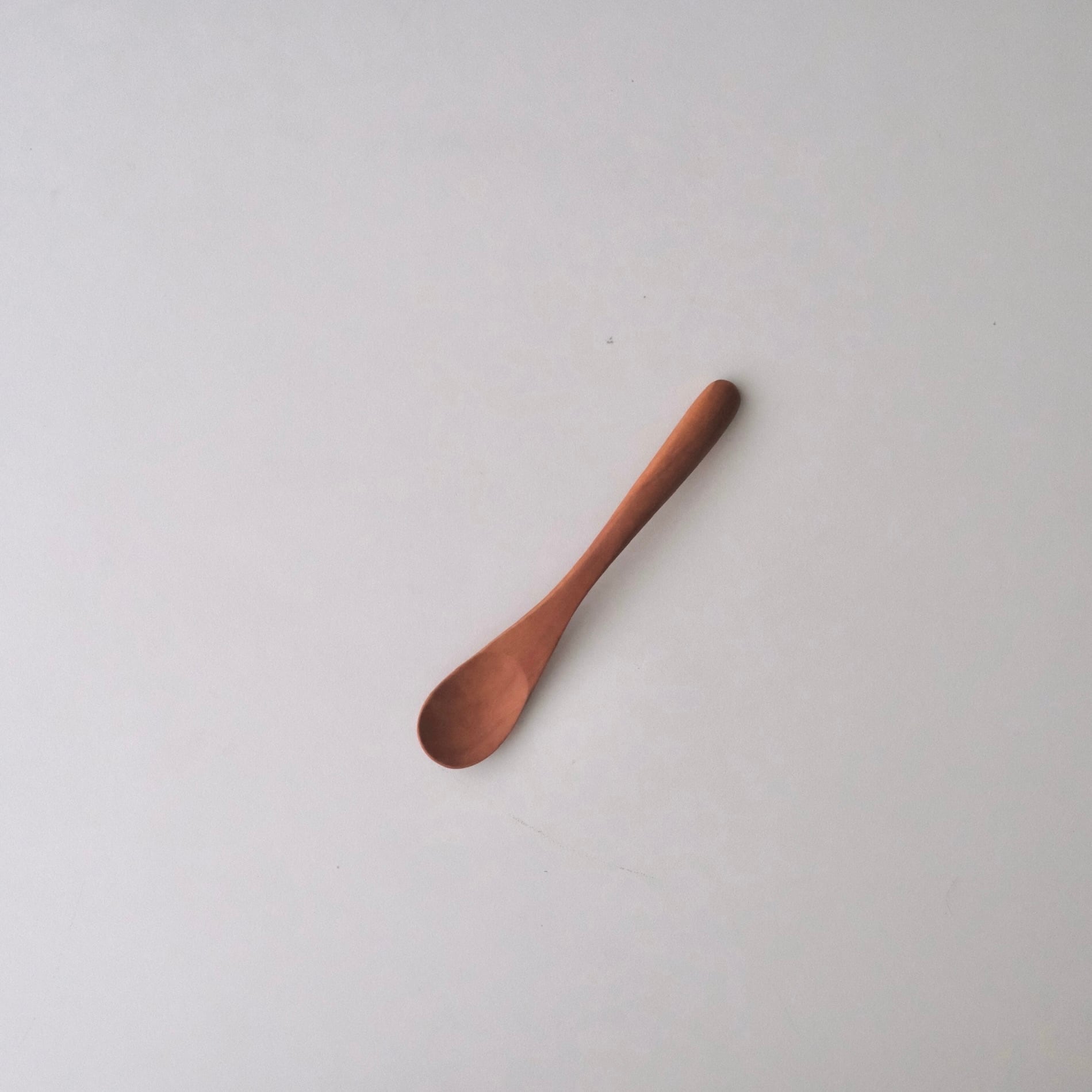 一般的なコーヒースプーンくらいのサイズ感の木のスプーン。ヘッド部分の幅が狭いので、デザートを食べる用途よりもドリンク用での使用がおすすめです。マットな質感。